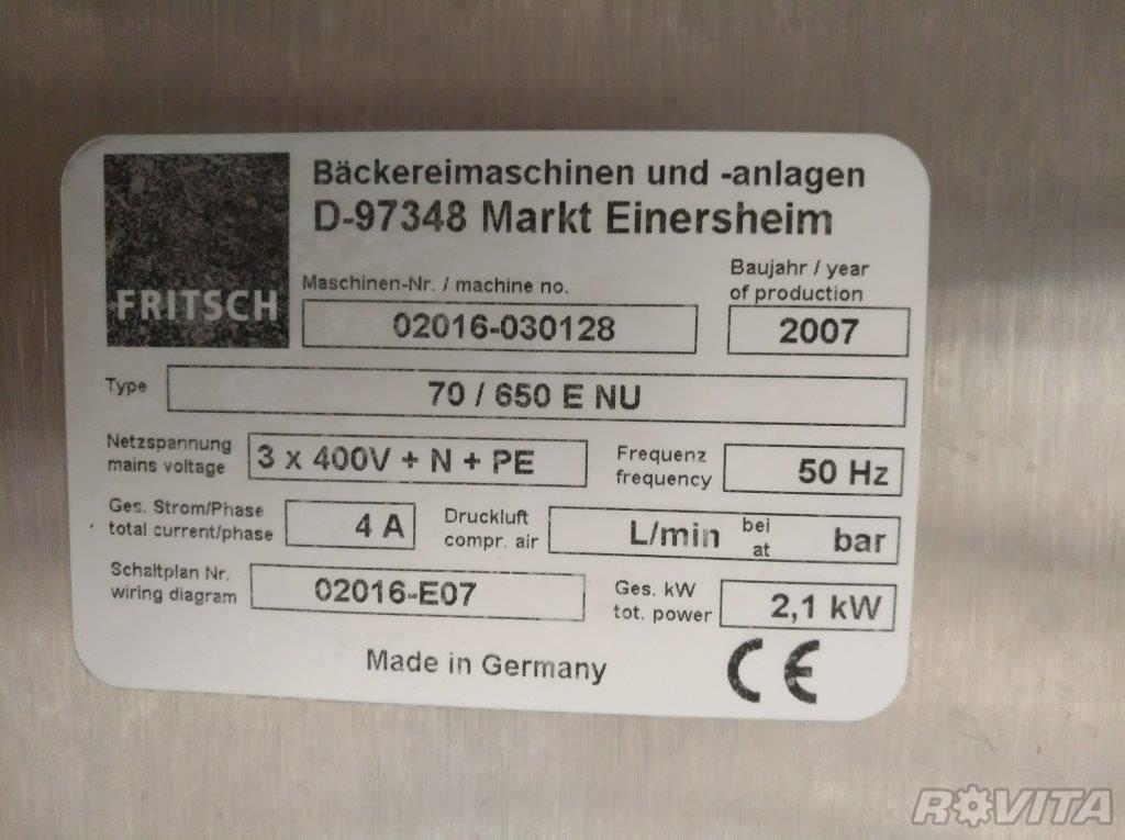 Renovated dough sheeter machine from German manufacturer Fritsch – Fritsch Rollfix 70/650 E NU, in good working condition for the food industry.